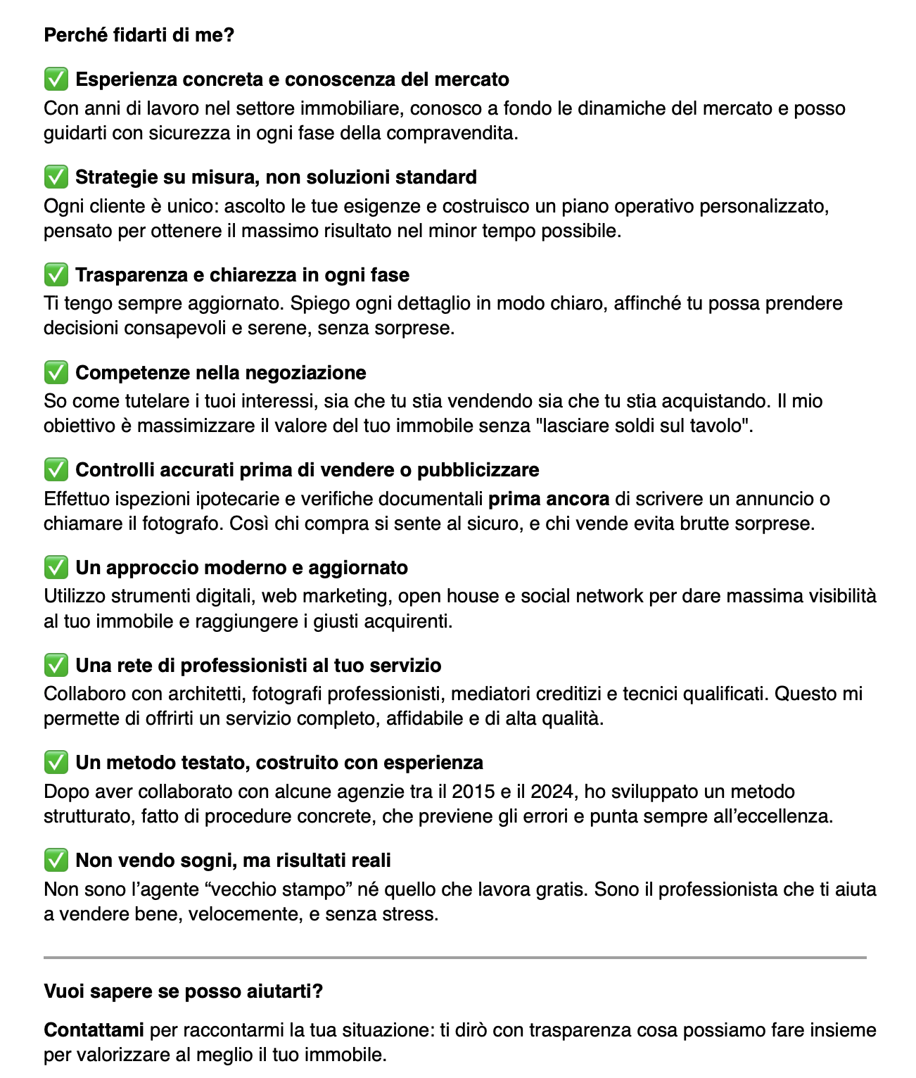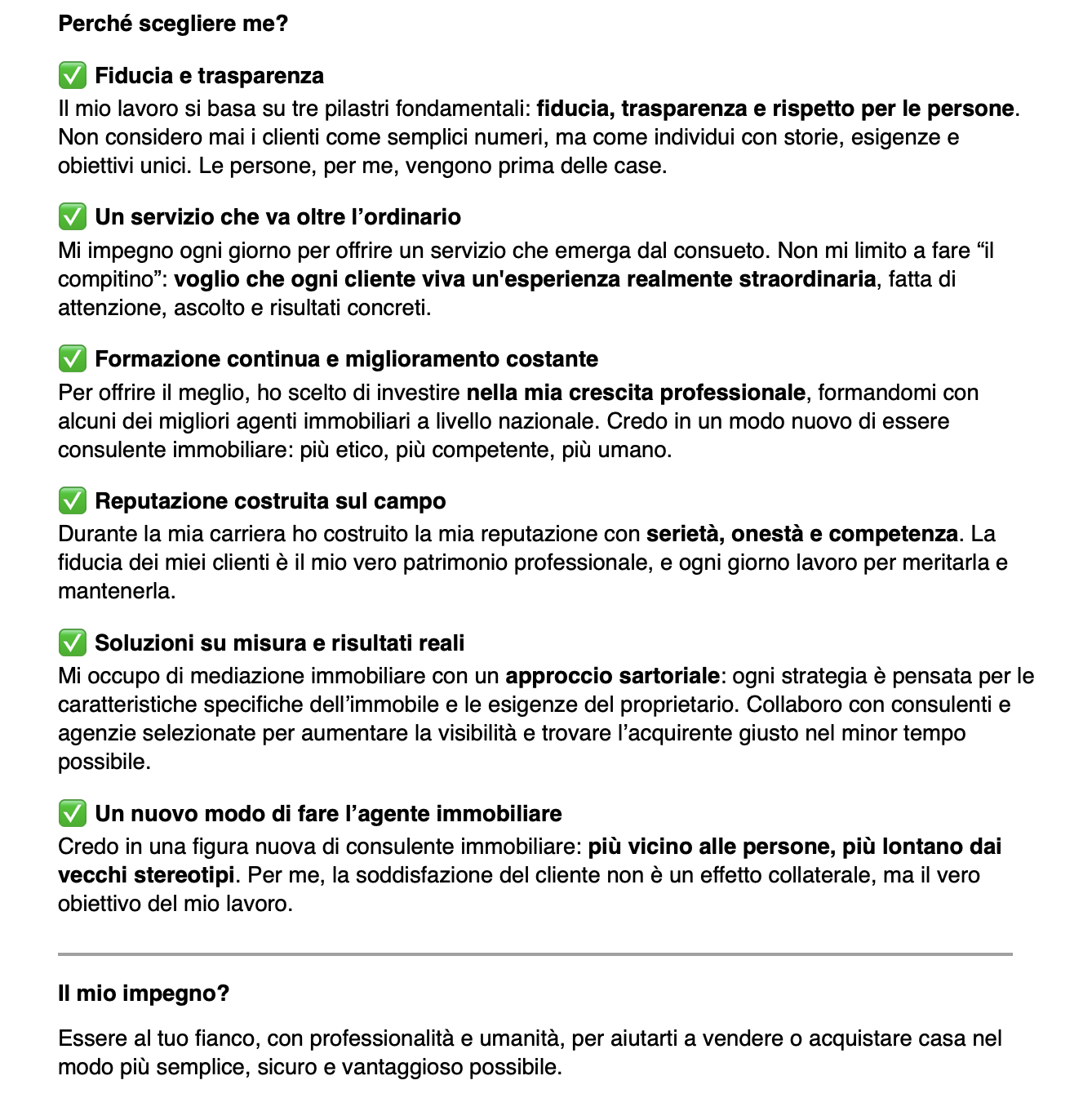 Uno dei miei punti di forza è la sinergia con tutte le altre agenzie immobiliari. Questo approccio collaborativo ci consente di raggiungere un pubblico ampio e qualificato, accelerando il processo di vendita e assicurando che il tuo immobile sia visibile al 100% dei potenziali acquirenti.